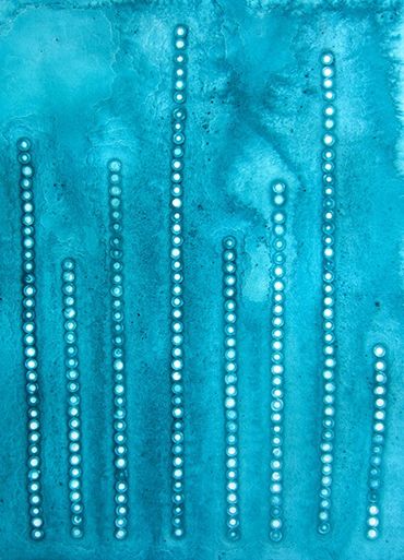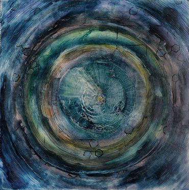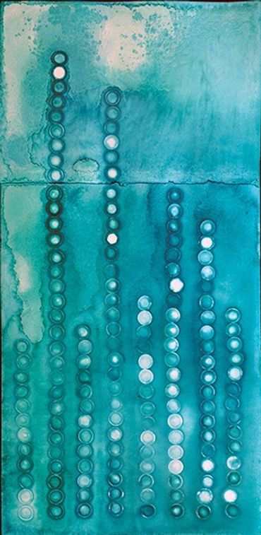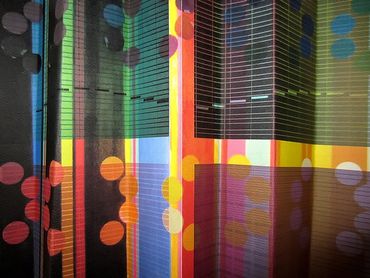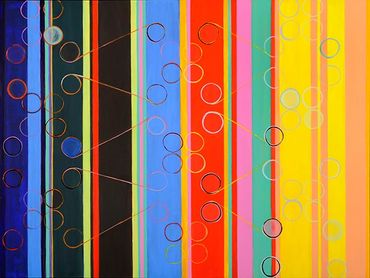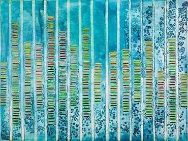 MoleculesofMusic is a series incorporating meta designs found in textiles, tiles and architecture, mapped over ColorSoundGrammar paintings. These designs, conceived by early humans also relate to modern scientific architectural structures, like DNA, String Theory and Chaos Theory.